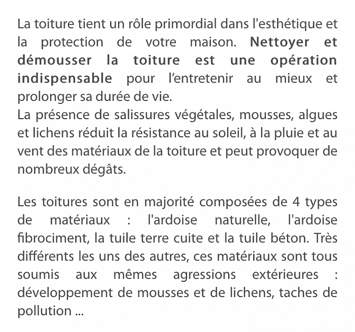 est couverte de mousse, la couleur est défraîchi, le remplacement des ardoises ou tuiles est trop coûteux. Restaurez votre toiture et prolonger sa durée de vie à moindre frais